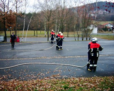 Der darauf folgende Teil bestand darin, eine Saugleitung mit 4 A-Schläuchen durch Schlauchtrupp, Wassertrupp, Maschinist und Gruppenführer "zusammenzukuppeln".