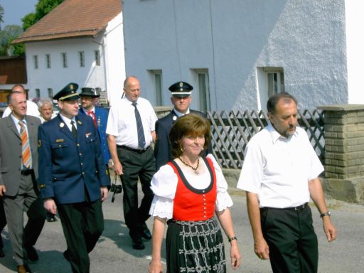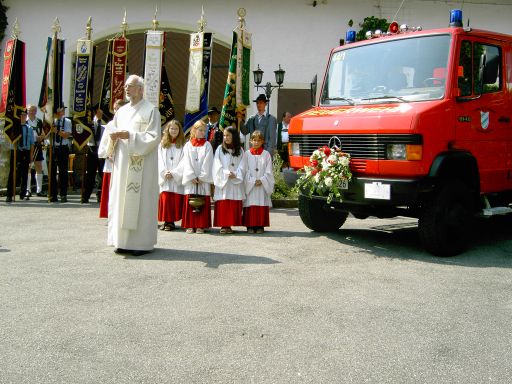 Um 10:30 Uhr stellten sich alle zum Kirchenzug auf und marschierten in den Innenhof des Gutshof Schmidt, wo Pfarrer Gottfried Rottner den verstorbenen Kameraden beim Festgottesdienst gedachte und anschließend das neue Tragkraftspritzenfahrzeug segnen durfte. Die Festkapelle Hermann Kuchler begleitete dabei mit der Schubert-Messe. Josef Seidl las die Fürbitten, in denen er Schutz für das neue Fahrzeug und die Besatzung der Feuerwehr erbat. Pfarrer Rottner übergab bei der anschließenden Segnung das Feuerwehrfahrzeug mit geistlichem Segen der Wehr.