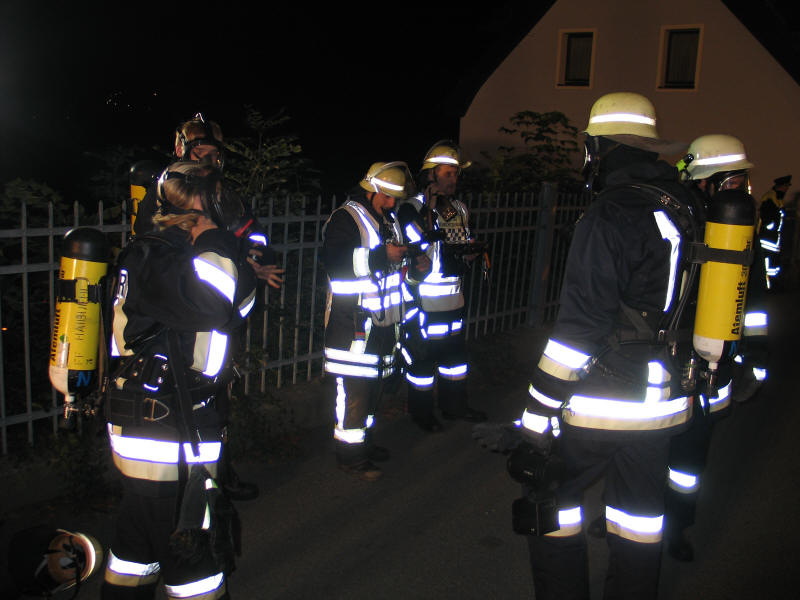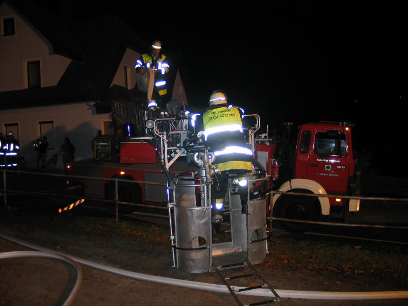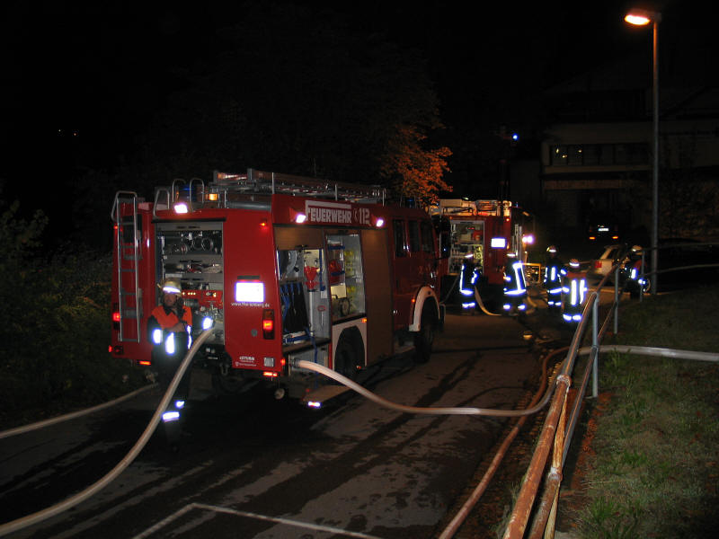 Nach der Alarmierung über Funksammelruf machten sich die Einsatzkräfte auf den Weg. Die Lamer Einsatzkräfte mit ihren Fahrzeugen, als erste am Übungsort, begann sofort nach der Erkundung mit der Personensuche und –rettung sowie mit dem Löschangriff von einem Hydranten aus. Mehrere Trupps unter Atemschutz drangen ins komplett verrauchte Haus vor. Das Übungsobjekt präsentierte sich hier sehr eindrucksvoll, eingehüllt von dicken Rauchschwaden im Nachthimmel und angestrahlt von den vielen Flutlichtstrahlern der Einsatzkräfte. Zufällig vorbeikommende Einheimische und Gäste dachten an einen wirklichen Einsatz. Die Feuerwehren aus Engelshütt und Thürnstein koordinierten den Aufbau von zwei ca. 500 m lange Förderleitungen vom Weißen Regen über den Schulweg hinauf bis zum Übungsobjekt, was innerhalb von knapp 20 Minuten erfolgte. Eine Herausforderung für die einzelnen Maschinisten war hier der große Höhenunterschied. Die weiteren Fahrzeuge der Feuerwehren Haibühl, Lohberg und Arrach wurden zur Unterstützung der Feuerwehr Lam direkt an die Übungsstelle beordert.