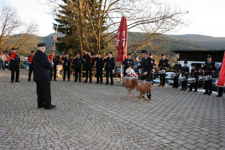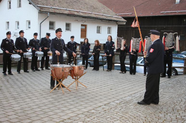 Die Mitglieder des Spielmannzugs nahmen auf der Terrasse Aufstellung und Ehrenkommandant und ehemaliger Tambourmajor Alois Mühlbauer ließ es sich nicht nehmen, persönlich den Stab zu führen. Nach dem musikalischem Gruß überreichte Vorsitzender Helmut Brunnhofer und Kommandant Josef Berlinger die Urkunde und einen großen Blumenstrauß. In Würdigung ihrer Verdienste um die Freiwillige Feuerwehr Ansdorf – Simpering wird Frau Melitta Mühlbauer zum Ehrenmitglied ernannt, stand in großen Buchstaben zu
