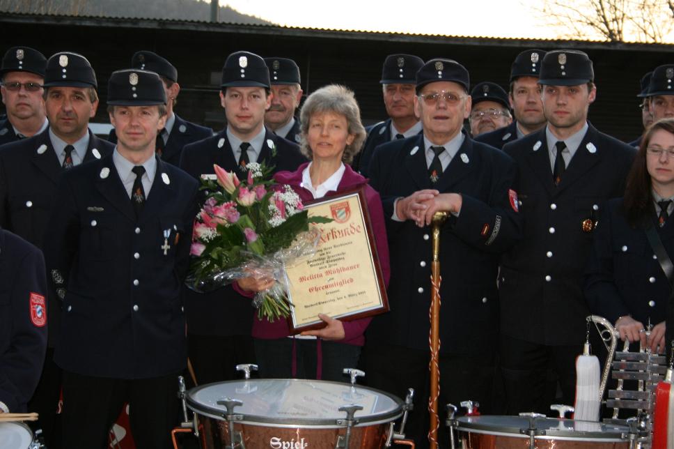 Melitta Mühlbauer ist neues Ehrenmitglied der Freiwilligen Feuerwehr Ansdorf – Simpering. Am 9. April 2011 machten sich die Mitglieder der Wehr und des Spielmannszugs auf den Weg nach Kummersdorf, um ihr diese Ehre zukommen zu lassen.