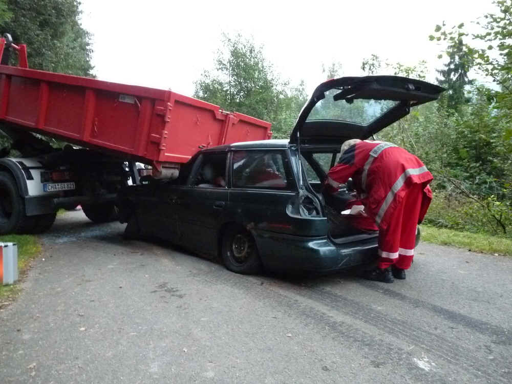 Unterdessen arbeitete die Feuerwehr Lam daran, die beiden Verletzten aus dem Fahrzeug am Heck des LKW zu befreien. Auch dies war eine besonders heikle Situation. Da die Hydraulikeinrichtung des LKW defekt war, konnte der Container nicht bewegt werden. Somit musste die Feuerwehr die Autotüren der Fahrerseite aufspreizen und mit der Rettungsschere entfernen. Um die Personen jedoch schonend aus dem Fahrzeug zu befreien, wurde zusätzlich das Dach entfernt. Erst dann konnten die Verletzen mittels Spineboard aus dem Fahrzeug befreit werden.