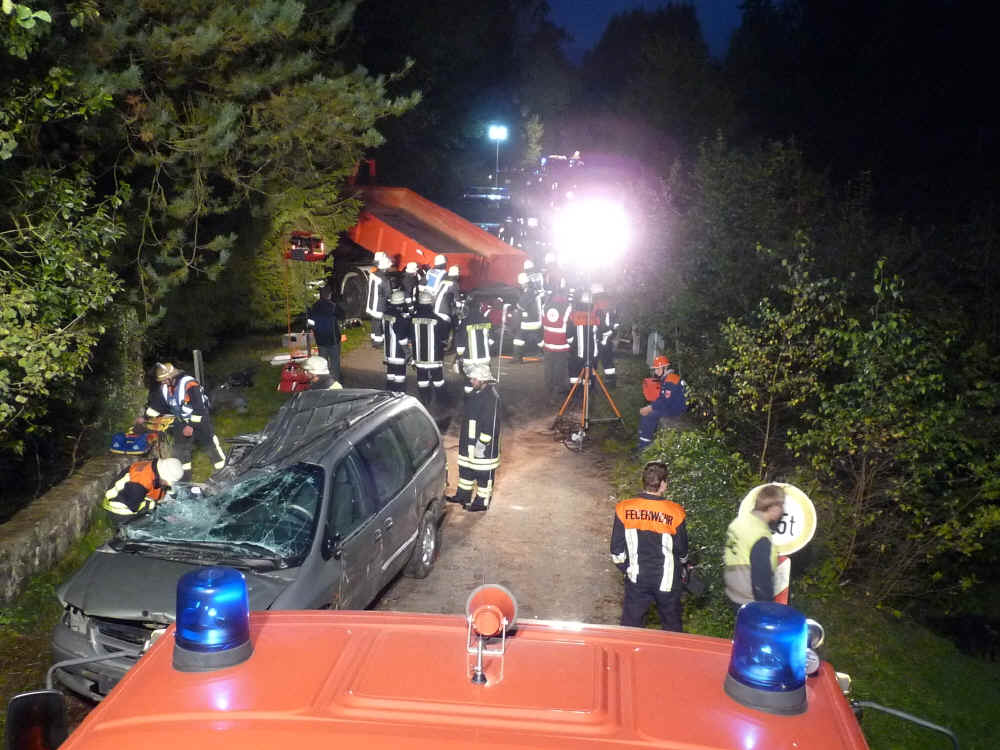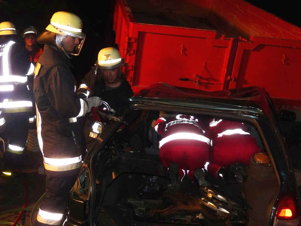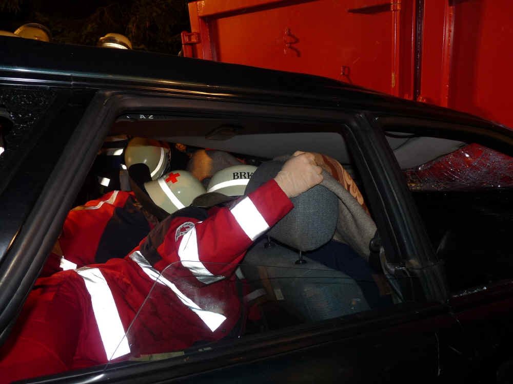 Ausgangslage war ein Verkehrsunfall mit zwei beteiligten PKW und einem LKW- Wechselladers, wobei die beiden PKW miteinander kollidierten. Ein Wagen blieb auf der Beifahrerseite am steinernen Geländer einer Brücke liegen, wogegen das andere Fahrzeug frontal in das Heck des LKW krachte und unter dem überstehenden Wechselcontainer stecken blieb. Insgesamt waren drei Personen eingeklemmt und eine aufgrund der Schockwirkung abgängig.