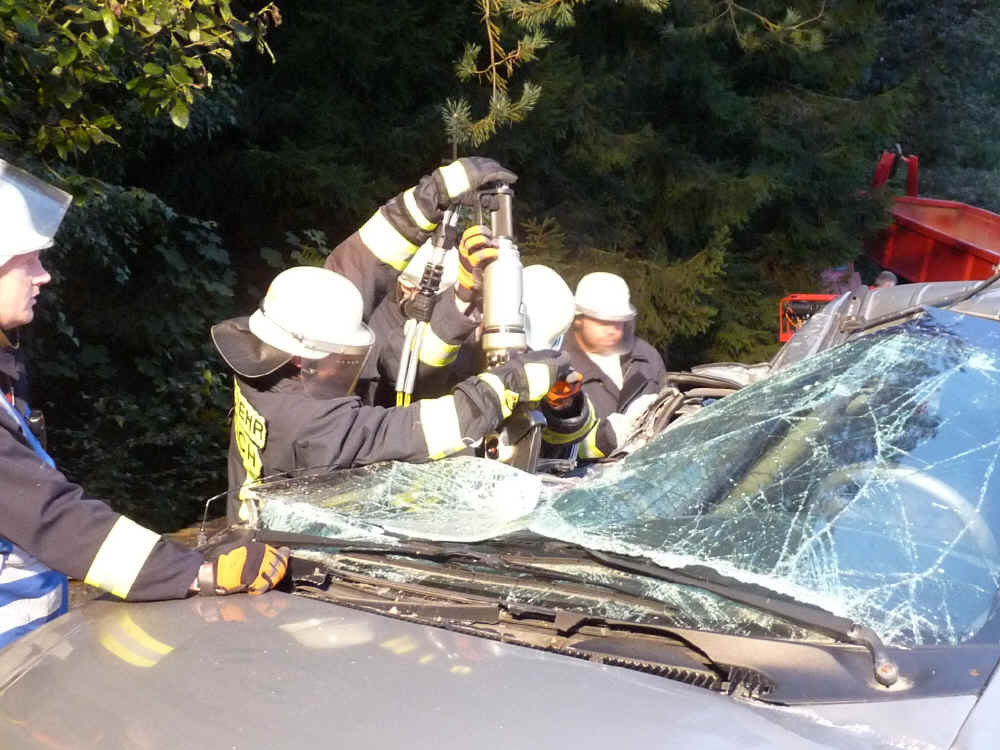 Die zuständige Ortsfeuerwehr Arrach machte sich ein Bild vom Unfallszenario. Da in beiden Fahrzeugen Personen eingeklemmt waren, übernahm Arrach das auf der Beifahrerseite liegende Fahrzeug. Um hier überhaupt an die verunfallte Person zu gelangen, mussten die Wehrmänner den PKW zuerst wieder auf alle „Viere" setzen. Hier war besondere Vorsicht geboten, um dem Verletzten nicht noch mehr Schaden zuzufügen. Danach verschaffte man sich Zugang ins Wageninnere, um den Patienten zu betreuen und das völlig eingedellte Dach mittels Rettungszylinder auseinander zu spreizen. Mit Hilfe von Rettungsspreizer und –schere verschafften sich die Retter schließlich Zugang ins Wageninnere. Dazu wurde die komplette Beifahrerseite des Fahrzeugs entfernt.