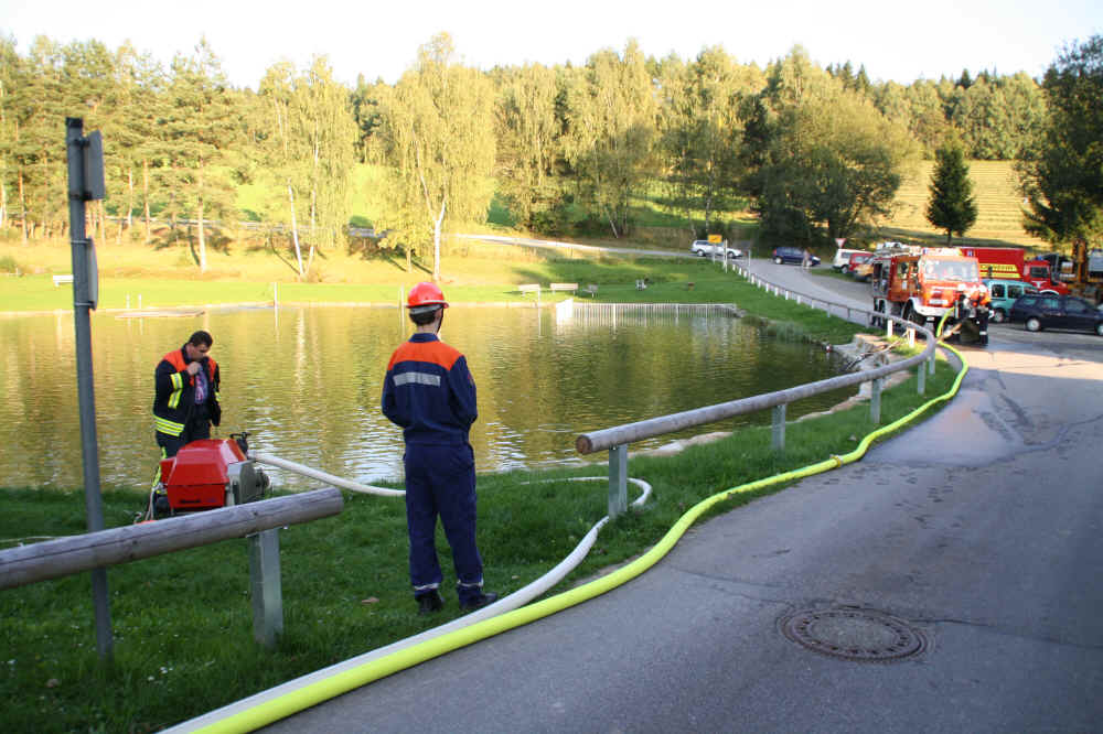Zwischenzeitlich erreichten auch die Wehren aus Thürnstein-Schrenkenthal und Lam die Einsatzstellle. Konrad Kellner wurde als Abschnittsleiter für die Löschwasserversorgung vom ca. 250 m entfernten Huberweiher bestimmt.