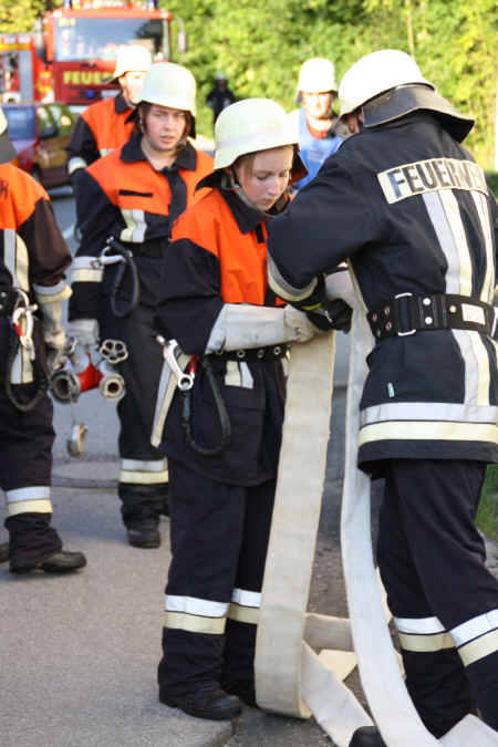 Als der angenommene Brand nach dem Aufbau der Löschwasserversorgung schließlich mit zahlreichen B- und C-Rohren bekämpft wurde erklärte der Einsatzleiter Martin Dachs das Übungsziel als erreicht.