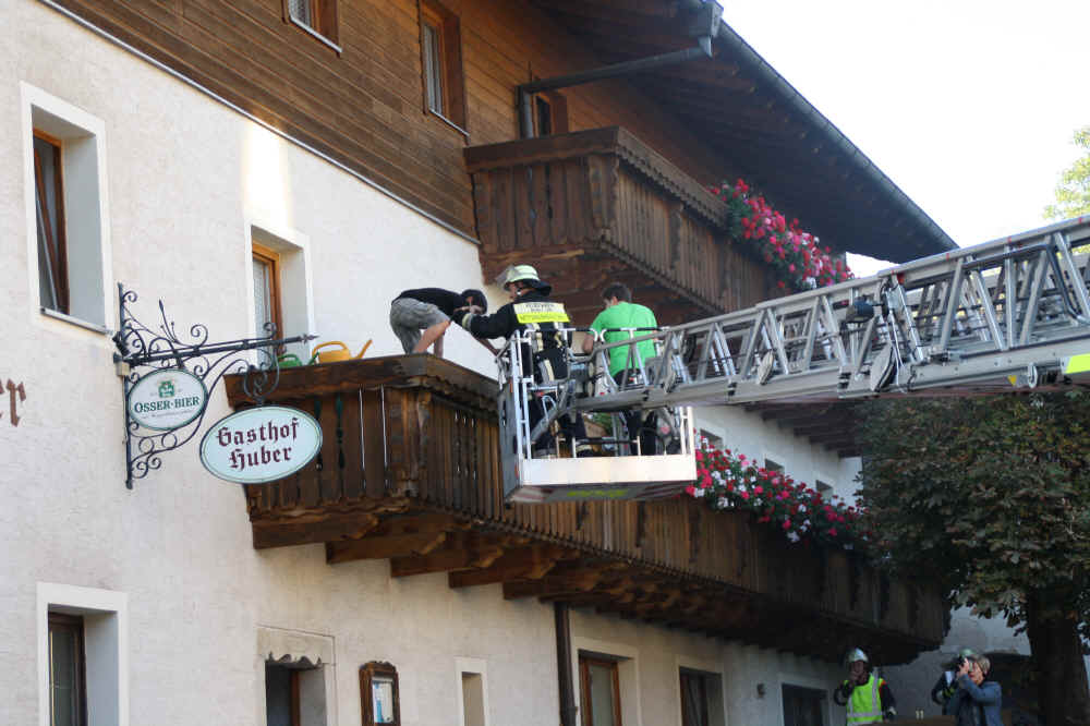 Mittels der Drehleiter aus Lam wurden zwei Personen vom Balkon der Gaststätte gerettet, bevor über das Wenderohr der DL die Brandbekämpfung über Dach unterstützt wurde.