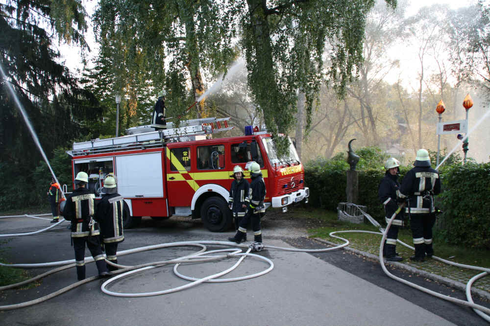Der angenommene Brand in einem Nebengebäude hat sich bereits beim Eintreffen der ersten Feuerwehren auf die beiden unmittelbar angrenzenden Gebäude, eine Gastwirtschaft und ein Wohnhaus übergegriffen, weshalb ein massiver Löscheinsatz erforderlich wurde, so die Übungsannahme.