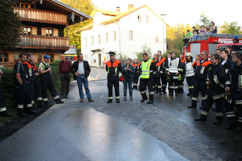 Nach dem Rückbau aller Gerätschaften der Feuerwehren, trafen sich die Übungsteilnehmer zur Abschlussbesprechung in der Dorfmitte. Martin Dachs begrüßte neben den Teilnehmern auch KBM Josef Pritzl, Bürgermeister Franz Müller und Ehren-KBM Reinhard Kollmer, die den Übungsverlauf mit großem Interesse verfolgt hatten.