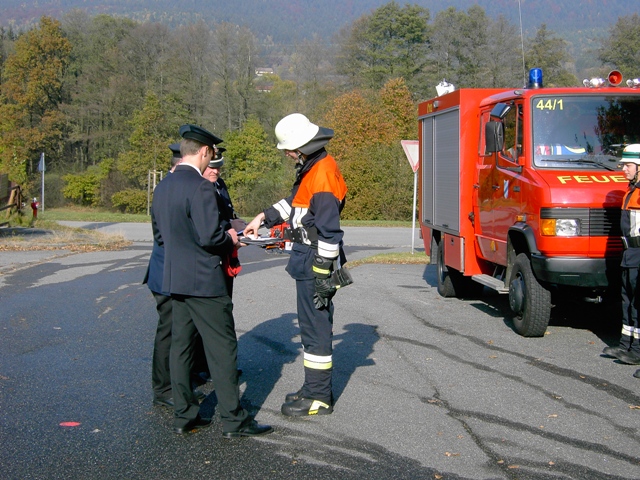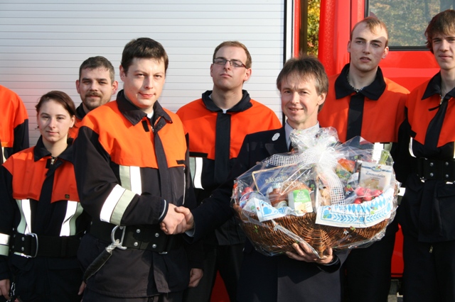 Bevor man sich im Feuerwehrgerätehaus noch zu einer gemütlichen Brotzeit einfand, bedankte sich Gruppenführer Tobias Aschenbrenner noch bei Kommandant Josef Berlinger, welcher in den zurückliegenden 12 Jahren, in der Aschenbrenner mit seiner Gruppe alle Leistungsabzeichen ablegte, sich immer wieder um die Ausbildung der Teilnehmer bemühte und diese auf die Prüfung vorbereitete.