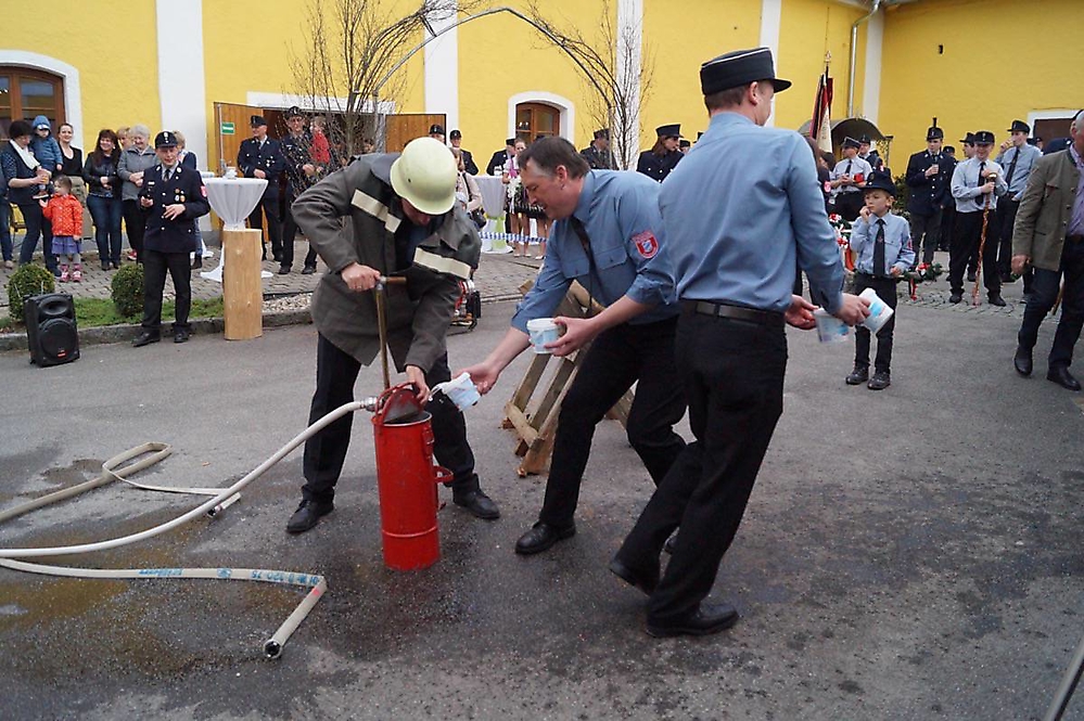 Als erste Aufgabe war ein Parcours zu einem Hausbrand zu absolvieren. Sechs Mann der Gotzendorfer Wehr und eine Feuerwehrfrau gaben ihr Bestes, als sie mit kleinen Eimern Wasser aus dem Brunnen vom Gutshof schöpften, durch den Slalomparcours rannten, eine Kübelspritze befüllten und wieder zurückliefen.