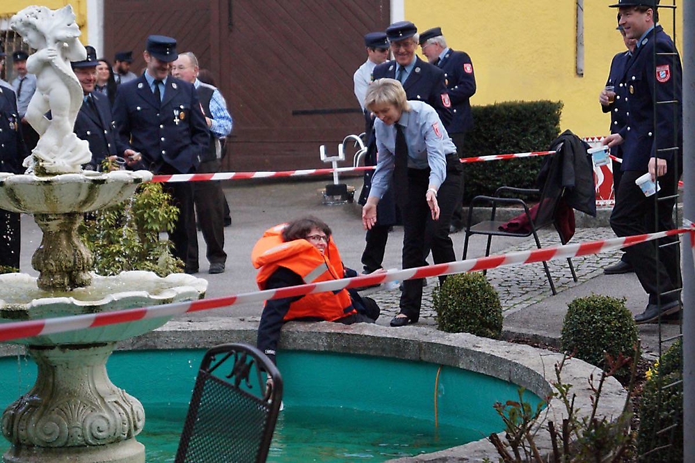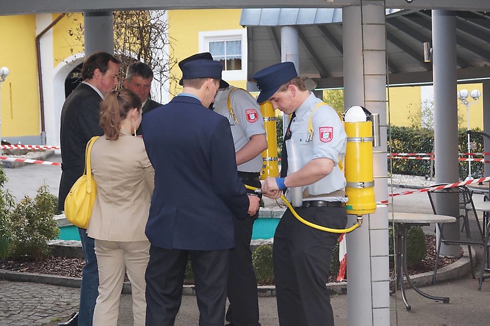 Die Atemschutzträger der FF Ansdorf-Simpering waren unterdessen pausenlos im Einsatz und versorgen die Anwesenden mit Getränken aus der Sauerstoffflasche, Spielmannszug und Blaskapelle spielten immer wieder auf.