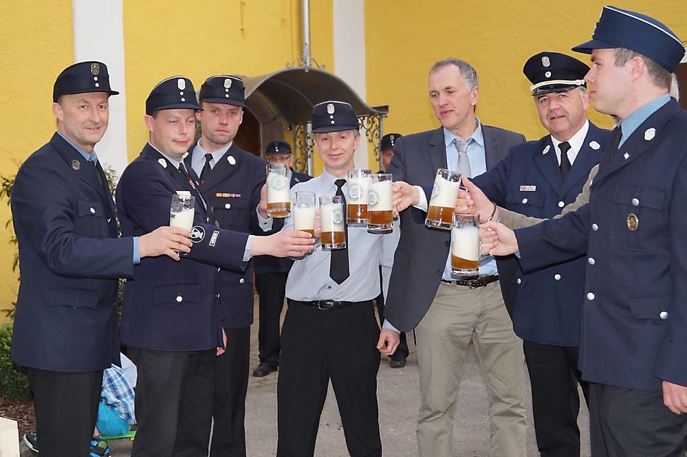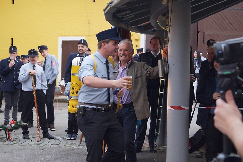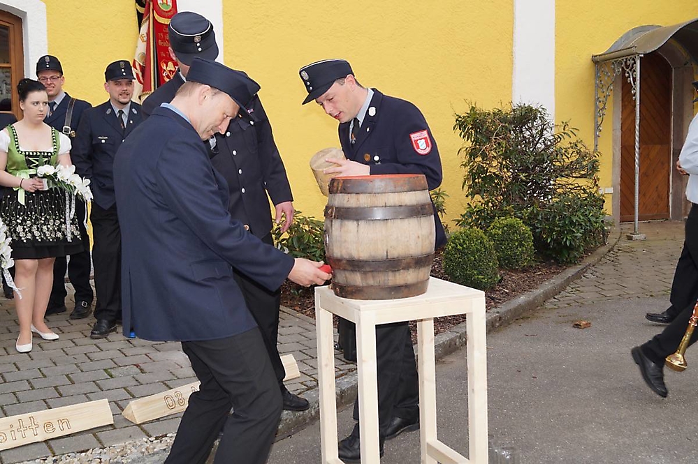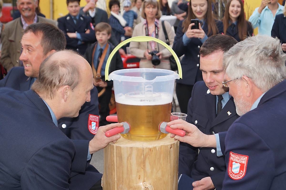 Das mitgebrachte Fass Bier zapfte der stv. Vorsitzende der Gotzendorfer Wehr, Günther Holhut, mit zwei Schlägen fast perfekt an und alle Honoratoren stißen auf ein gutes Fest an.