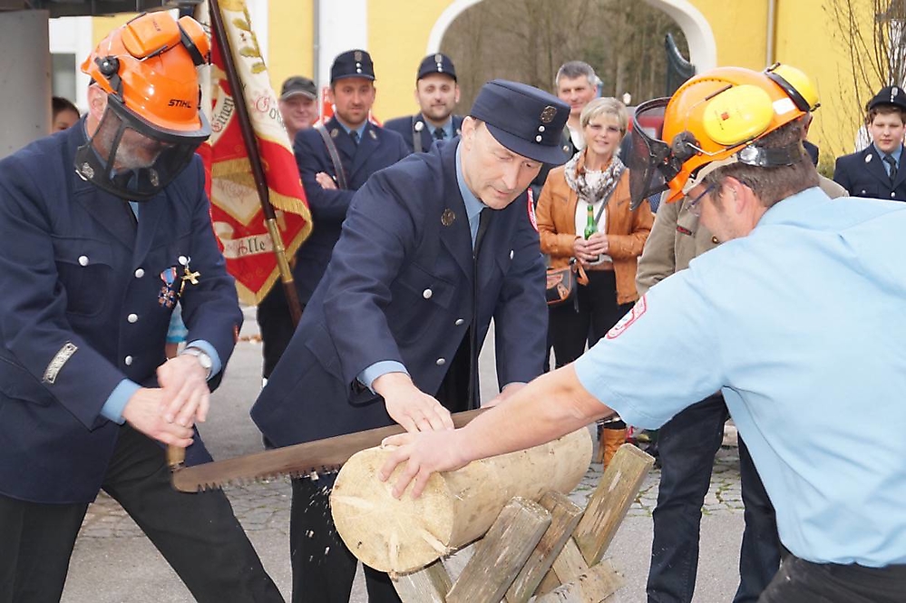 Als Zweites war eine technische Hilfeleistung zu bewältigen. Von einem Holzstamm musste eine Scheibe gesägt werden, die genau 2,3 Kilogramm wiegen sollte, jede 100 Gramm zu viel oder zu wenig wurde mit einem Schnaps "bestraft".