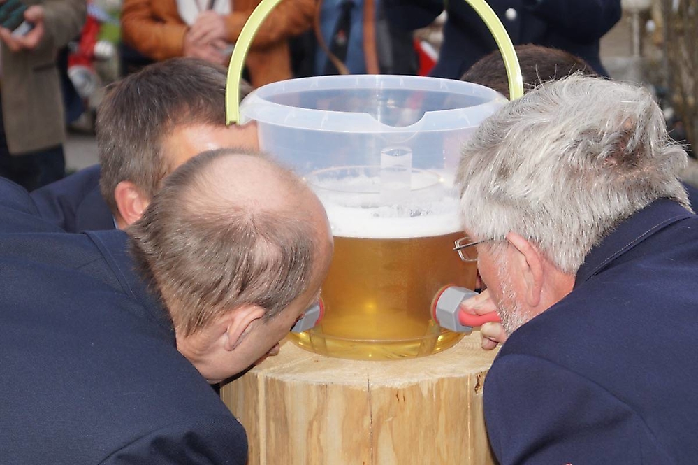 Die dritte Aufgabe war für vier Kameraden vorbereitet. Ein Eimer mit drei Mass Bier musste "ausgezuzzelt" werden und diese Disziplin beherrschten die Gotzendorfer aus dem Effeff. Somit war auch "Saugprobe" bestanden.