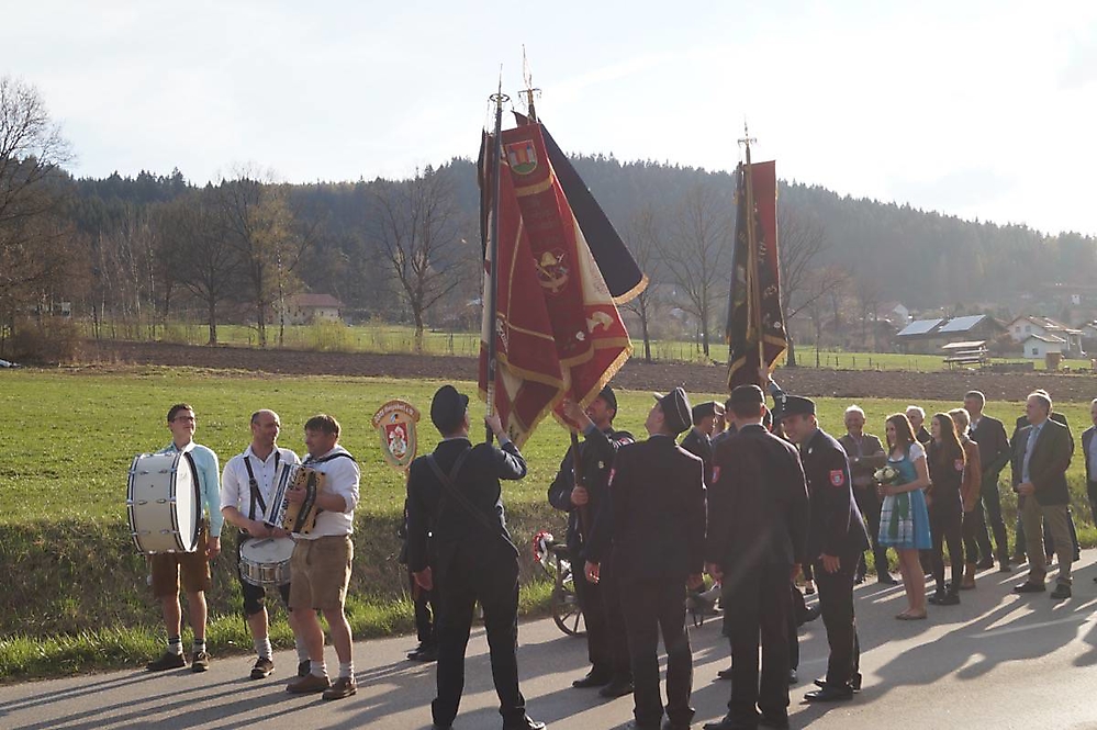 Am Bahnhof nahmen die Feuerwehrkameraden aus Gotzendorf mit den Ehrengästen Aufstellung und marschierten unter den Klängen der Kapelle "Die Filzläuse" und mit einem Schubkarren mit dem geschmückten Bierfass nach Simpering zur Gutscherkapelle der Familie Amberger.