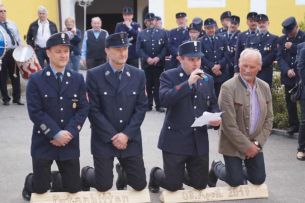 Als Erstes trugen von der FF Gotzendorf Vorsitzender Andreas Fassot, sein Stellvertreter Günther Holhut, Franz Pfeffer jun. und Schirmherr in spe, Josef Schmid, die Patenbitte auf extra angefertigten scharfkantigen Holzscheitl knieend vor.
