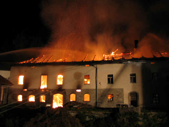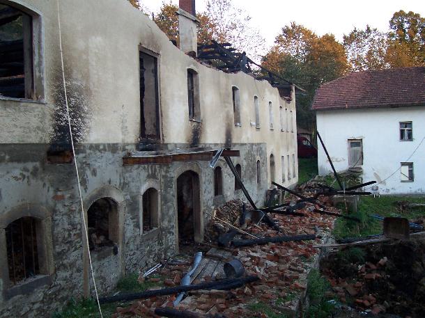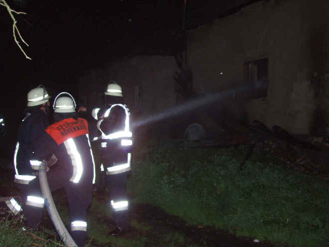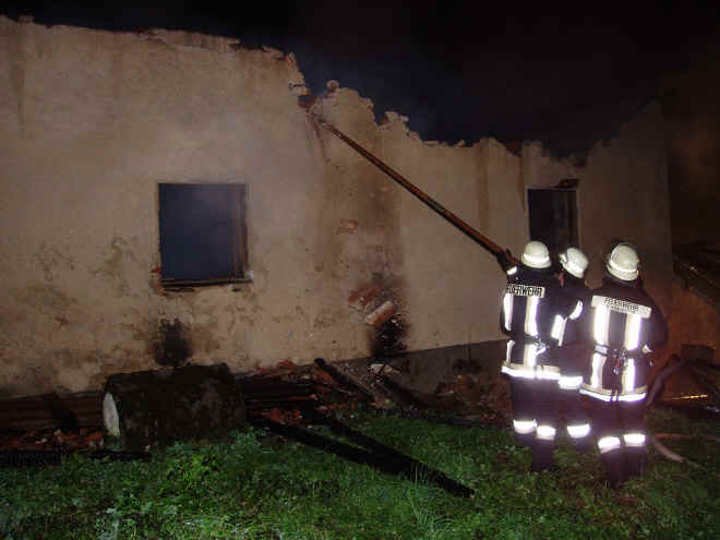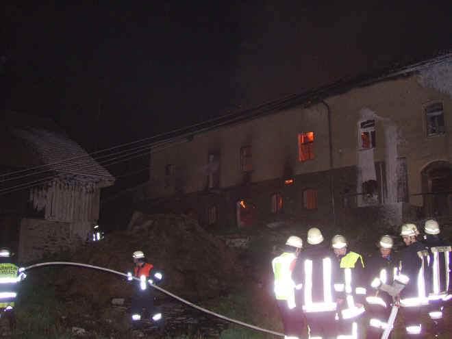 Nachdem die Dachüberstände entfernt und lose Mauerteile eingestoßen waren, konnte über die Fenster die letzten Brandstellen im Gebäude abgelöscht werden. Der Einsatz der ebenfalls eingetroffenen Drehleiter der FF Bad Kötzting war wegen der äußerst schlechten Zufahrt nicht möglich.