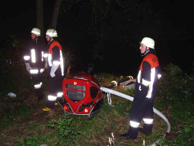 Somit wurde im Erstangriff je eine Widerstandslinie zu den in der unmittelbaren Nähe stehenden Scheune und dem weiteren Wohnhaus errichtet, während die nachfolgenden Wehren zwei B-Förderleitungen vom ca. 700 m entfernten Regen aufbauten. Diese Aufgabe wurde vom Abschnittsleiter KBM Josef Pritzl in der Form koordiniert, dass die Leitungen zu beiden Seiten des Weges verlegt wurden und somit die Zufahrt zum Brandobjekt auch weiterhin noch möglich war.