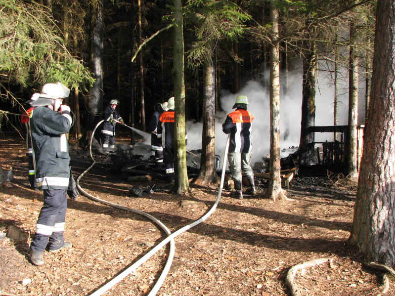 Als die Feuerwehren aus Gotzendorf und Hohenwarth die Einsatzstelle erreichten, stellten sie Brandrauch am Waldrand nördlich von Thening fest. Nach weiterer Erkundung wurde der Vollbrand eines Schuppens festgestellt.