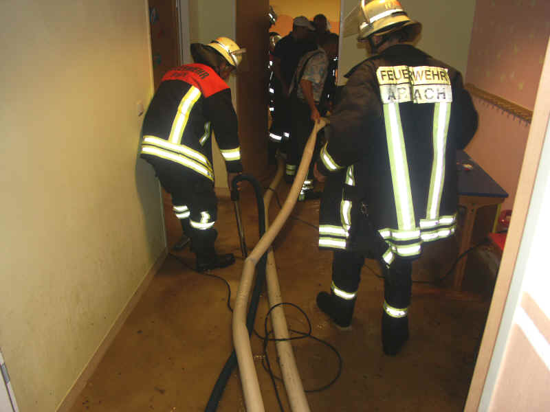 Eine besonders hohe Anzahl an Einsatzstellen wurde in Hohenwarth gemeldet. Hier wurde die Feuerwehr gegen 15.30 Uhr alarmiert. Neben zahlreicher überfluteter Keller und Wohnräume wurden hier besonders auch die Räume im Untergeschoss des gemeindlichen Kindergartens betroffen. Etwa 30 cm stand hier Wasser und Schlamm in den Gruppenräumen und musste mit Tauchpumpen und Schlammsaugern entfernt werden.