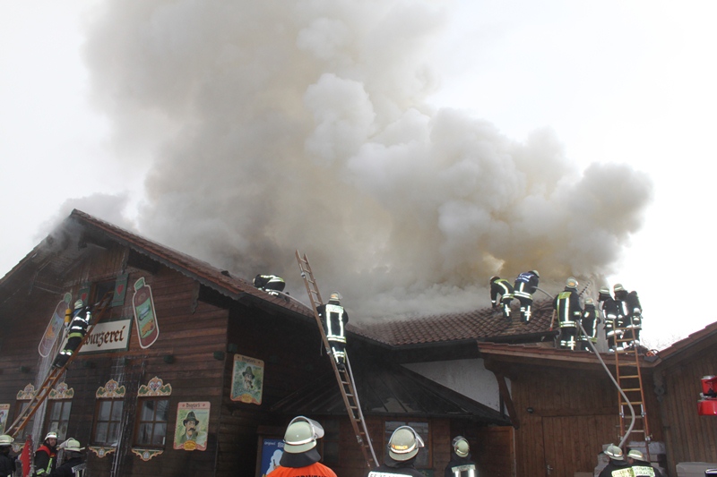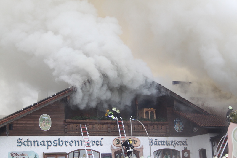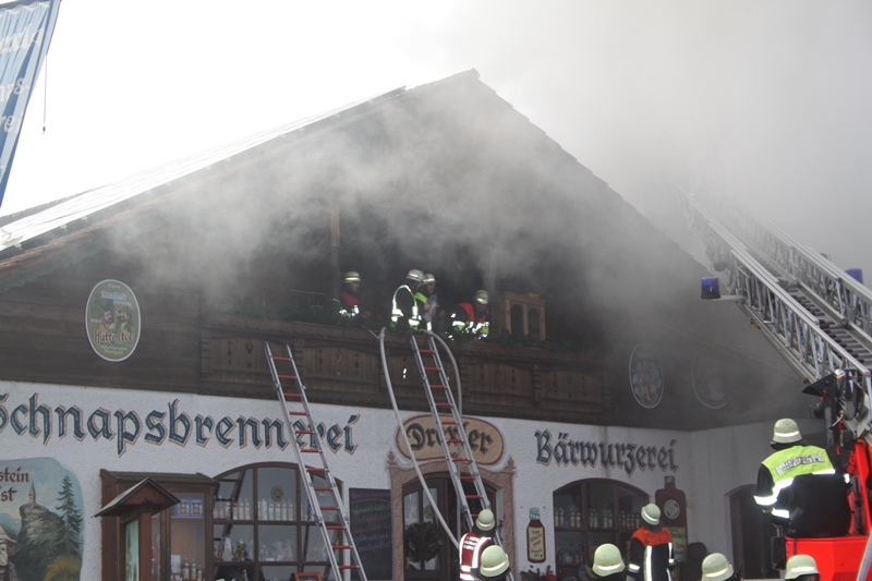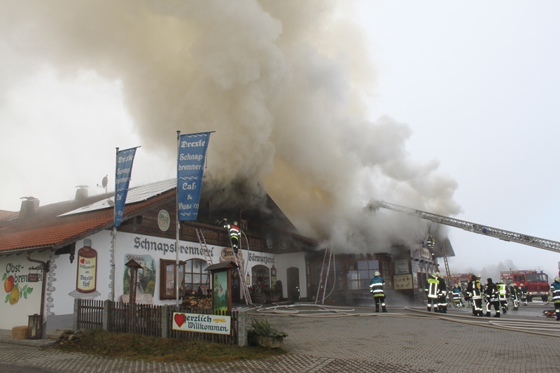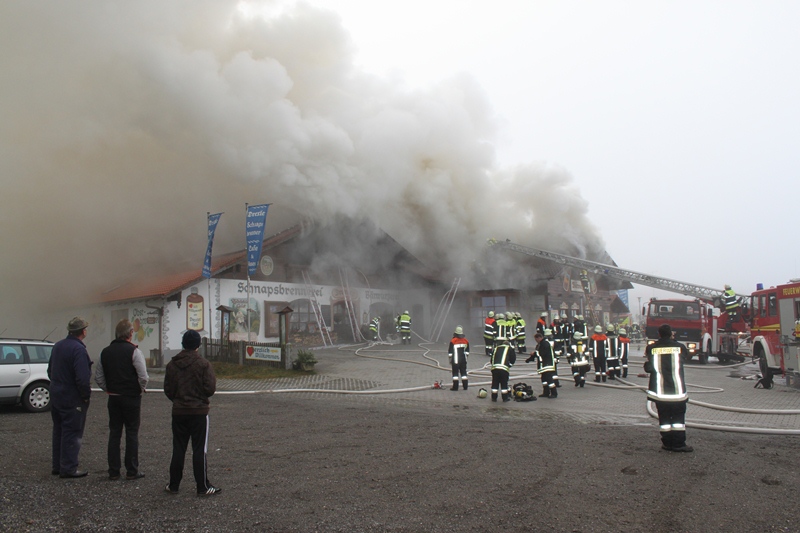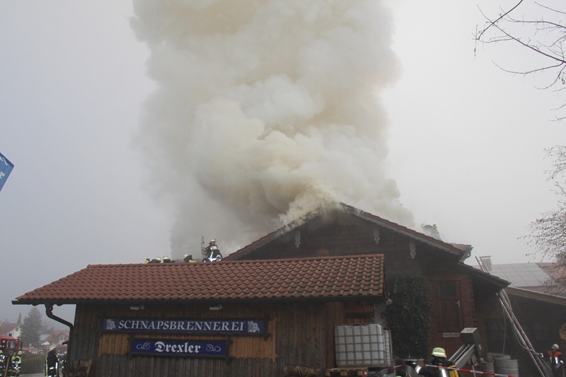 Als die ersten Einsatzkräfte an der Einsatzstelle eintrafen, zeichnete sich schnell ab, dass es sich vermutlich um einen Dachstuhlbrand handelte, sodass Einsatzleiter Stefan Schmid, stv. Kommandant der Feuerwehr Arrach, die Alarmstufe erhöhen ließ. Zu diesem Zeitpunkt stiegen bereits starke Rauchschwaden unter dem Dachstuhl der Schnapsbrennerei empor. Personen waren nicht mehr im Gebäude.