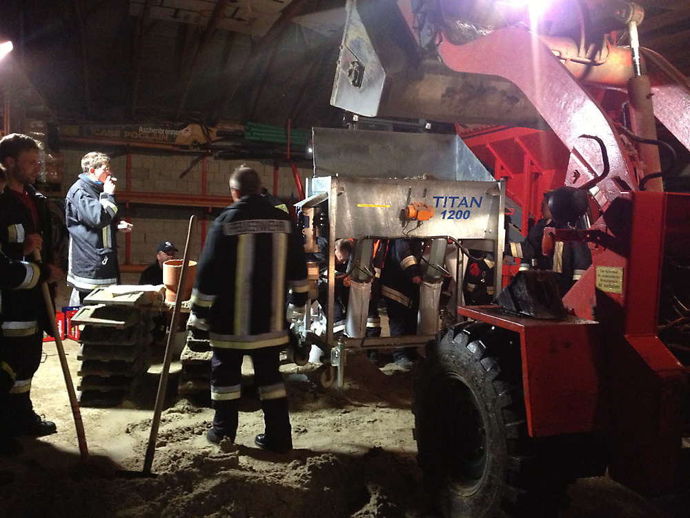 Mehrere Paletten Sandsäcke aufgrund Hochwasser befüllt und an kritischen Stellen bereitgelegt.