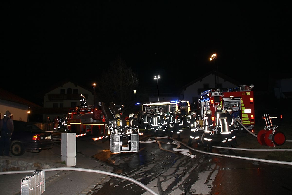 Auch die nachfolgend eintreffende Feuerwehr aus Lam stellte Atemschutzgeräteträger bereit und die Drehleiter wurde für einen Einsatz über Dach in Stellung gebracht. Der Erstangriff wurde noch mit dem mitgeführten Löschwasser der Fahrzeuge vorgenommen, zeitgleich wurden aber auch Hydranten zur weiteren Löschwassersicherung herangezogen.
