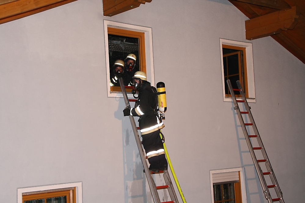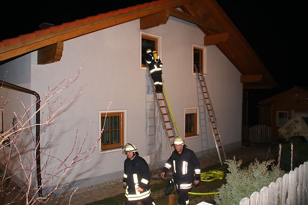 Von den Feuerwehren Haibühl-Ottenzell und Arrach wurden sofort Atemschutztrupps zur Brandbekämpfung über die Treppe in das Wohnhaus beordert. Über Steckleitern wurde zudem ein weiterer Zugang von außen in das Dachgeschoss geschaffen.