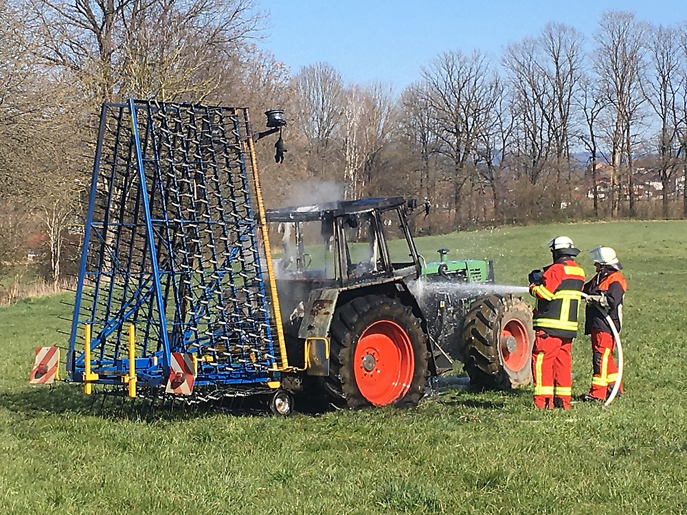 Gegen 15 Uhr war ein Landwirt in Gotzendorf mit seinem Traktor zu Feldarbeiten unterwegs, als er eine Rauchentwicklung an seinem Gerät bemerkte. Um die Flammen eindämmen zu können, versuchte er diese mit zwei aus den dem nahen Anwesen herbeigeholten Feuerlöschern abzulöschen. Zudem wurden von der Leitstelle Regensburg neben der Feuerwehr aus Gotzendorf noch die Feuerwehren aus Hohenwarth, Ansdorf-Simpering, Arrach und Grafenwiesen zusammen mit der Feuerwehrführung mit KBR Michael Stahl, KBI Marco Greil und KBM Konrad Kellner an die Einsatzstelle alarmiert.